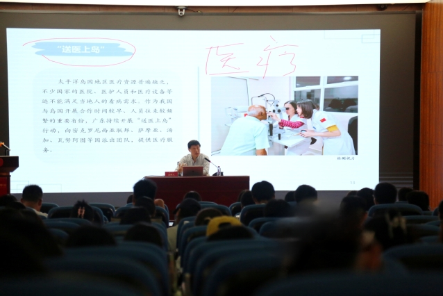 傅朗的外交生涯逾四十载,涵盖军事外交、地方外事与公共外交等多个领域。他出访过世界130多个国家,亲身参与并见证了中国改革开放与“一带一路”倡议的推进历程,并积极投身于南太平洋岛国工作,具备丰富的国际交流与外交实践经验。讲座中,他从新时期中国对外交往的核心理念出发,系统阐述了推动共同发展、深化对外开放、参与全球治理等重要议题,并结合“送医上岛”“送戏下海”“送才深造”等生动案例,讲述了中国与亚洲、欧洲、非洲、美洲及大洋洲各国的友好合作实践,展现了中国在国际交流中的积极作为与丰硕成果。