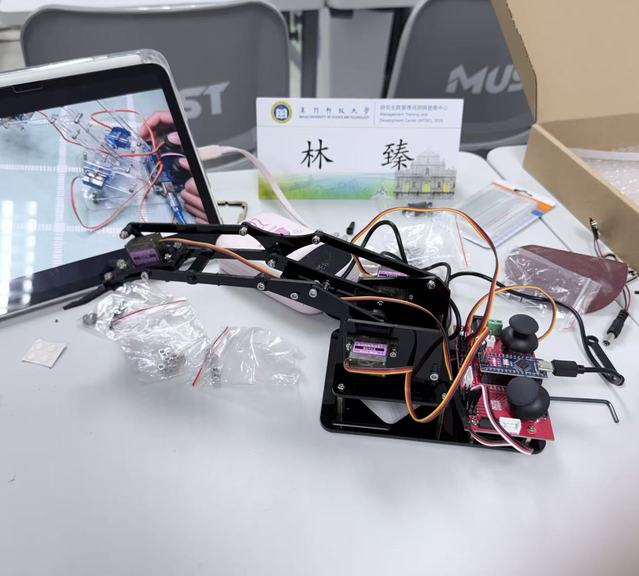 本次课程的另一大亮点,是工程应用实践模块的系统安排。从机械臂的工作原理讲解,到电路板焊接、机械臂组装与舵机调试等实操环节,我们在教师的指导下,从零开始一步步完成每一项任务。过程中难免遇到焊接不牢、调试失败等问题,但正是这些挑战,锤炼了我们的动手能力、逻辑思维与团队协作意识。